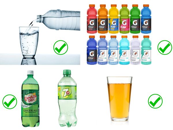 clear apple juice, ginger ale, 7up, gatorade and water.