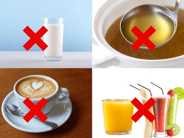 NO milk, homemade juice/smoothies, coffee, soup broth, or fluids you cannot see through (ex. orange juice, mango juice etc).